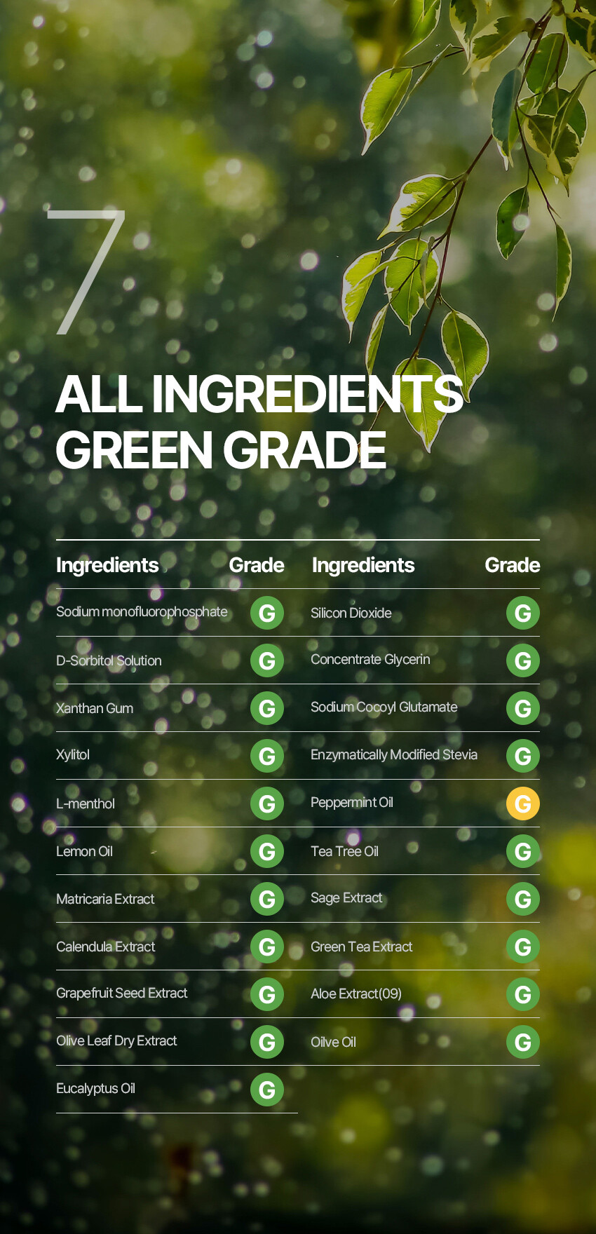 Silicon Dioxide, D-Sorbitol Solution, Water, Sodium Cocoyl Glutamate, Xanthan Gum, Sage Extract, Aloe Extract, Sodium Monofluorophosphate, Peppermint Oil, Xylitol, Enzymatically Modified Stevia, L-Menthol, Eucalyptus Oil, Green Tea Extract, Matricaria Extract, Grapefruit Seed Extract, Glycerin